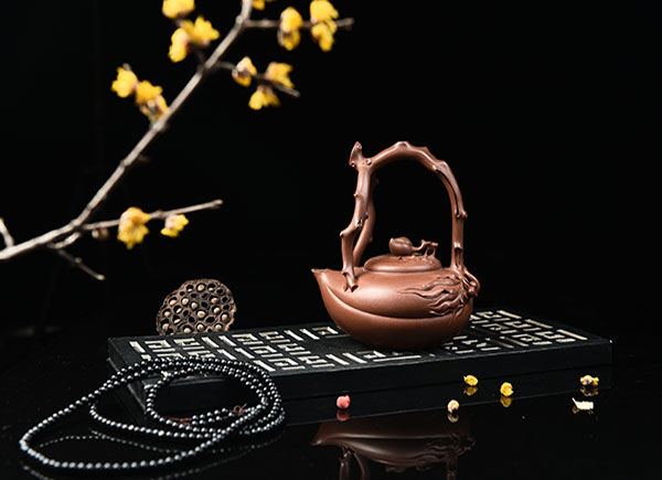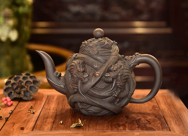 葛岳純父子皆擅長(zhǎng)花貨的制作,其中家族代表作九龍至尊壺是由葛超美設(shè)計(jì),其父親葛岳純制作完成,遠(yuǎn)看壺型整體氣韻流暢,近看做工精美無(wú)暇,是父子合作的經(jīng)典之作,現(xiàn)已注冊(cè)外觀專利和終身版權(quán)。后葛超美在其父親傳統(tǒng)技法的基礎(chǔ)上,吸收其藝術(shù)菁華,創(chuàng)造革新,制作出更為精致、富有立體感的九龍至尊壺,九龍盤壺戲珠,浮雕云騰致雨,精致于細(xì)發(fā),大氣于天地,寓意天降祥瑞,國(guó)泰民安。